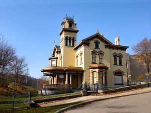 Yellow Victorian Mansion situated behind the levee along the Ohio river.